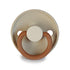 As chupetas FRIGG têm uma ligeira curvatura para afastar a chupeta da pele delicada do bebé e duas aberturas para ventilação.