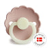 As chupetas FRIGG daisy têm uma estrutura que imita as pétalas de uma flor. Têm uma ligeira curvatura para afastar a chupeta da pele delicada do bebé e duas aberturas para ventilação.