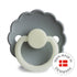 As chupetas FRIGG daisy têm uma estrutura que imita as pétalas de uma flor. Têm uma ligeira curvatura para afastar a chupeta da pele delicada do bebé e duas aberturas para ventilação.