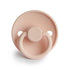 As chupetas FRIGG têm uma ligeira curvatura para afastar a chupeta da pele delicada do bebé e duas aberturas para ventilação.